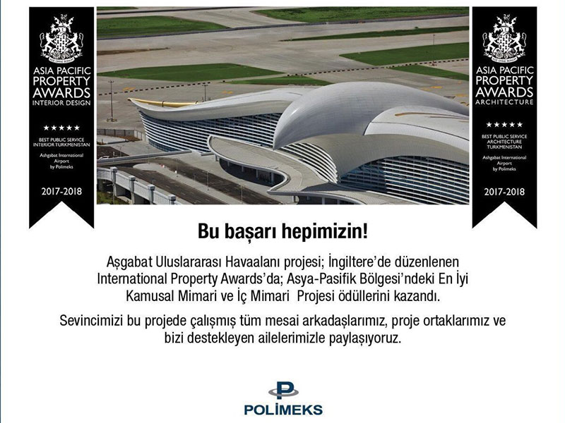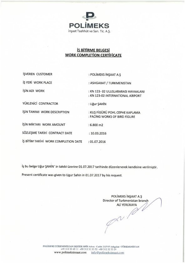 AŞKABAT ULUSLARARASI HAVAALANI Bilgi Formu +90 312 353 7050 Daha fazla bilgi almak için Bilgilendirme Polimeks İnşaat A.Ş. Aşkabat / TÜRKMENİSTAN Alüminyum panel kaplama montajı (Alman menşeli Pohl marka) Yurtdışı Projeler CUMHURBAŞKANLIĞI HAVALİMANI Polimeks İnşaat A.Ş. Aşkabat / TÜRKMENİSTAN HASIL OTELİ Şahin İnşaat Awaza / TÜRKMENİSTAN 45.000 Kişilik OLİMPİYAT KOMPLEKSİ STADYUMU AT BAŞI FİGÜRÜ Polimeks İnşaat A.Ş. Aşkabat / TÜRKMENİSTAN 2016 Demir Kırgız Uluslararası Banka İnşaatı Suntar Bişkek İnşaat KIRGIZİSTAN 2016 Girne Turizm Limanı Emek İnşaat - Yega Ltd. KIBRIS 2016 İş Merkezi İnşaatı Suntar Bişkek İnşaat KIRGIZİSTAN 2016 Artemis Otel Kaya Holding KIBRIS 2016 Kıbrıs Toyota Plaza Emek İnşaat - Yega Ltd. KIBRIS