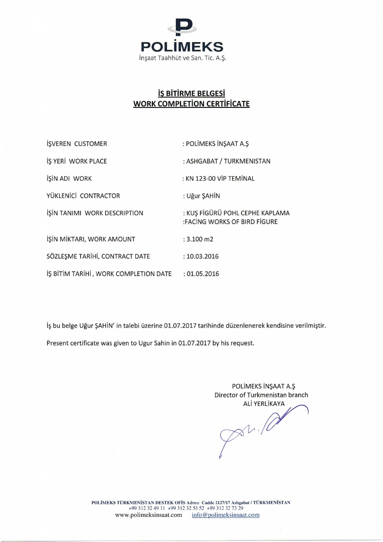 CUMHURBAŞKANLIĞI HAVALİMANI Bilgi Formu +90 312 353 7050 Daha fazla bilgi almak için Bilgilendirme Polimeks İnşaat A.Ş. Aşkabat / TÜRKMENİSTAN Alüminyum panel kaplama montajı ( Alman menşeli Polh marka ) Yurtdışı Projeler HASIL OTELİ Şahin İnşaat Awaza / TÜRKMENİSTAN AŞKABAT ULUSLARARASI HAVAALANI Polimeks İnşaat A.Ş. Aşkabat / TÜRKMENİSTAN 45.000 Kişilik OLİMPİYAT KOMPLEKSİ STADYUMU AT BAŞI FİGÜRÜ Polimeks İnşaat A.Ş. Aşkabat / TÜRKMENİSTAN 2016 Demir Kırgız Uluslararası Banka İnşaatı Suntar Bişkek İnşaat KIRGIZİSTAN 2016 Girne Turizm Limanı Emek İnşaat - Yega Ltd. KIBRIS 2016 İş Merkezi İnşaatı Suntar Bişkek İnşaat KIRGIZİSTAN 2016 Artemis Otel Kaya Holding KIBRIS 2016 Kıbrıs Toyota Plaza Emek İnşaat - Yega Ltd. KIBRIS